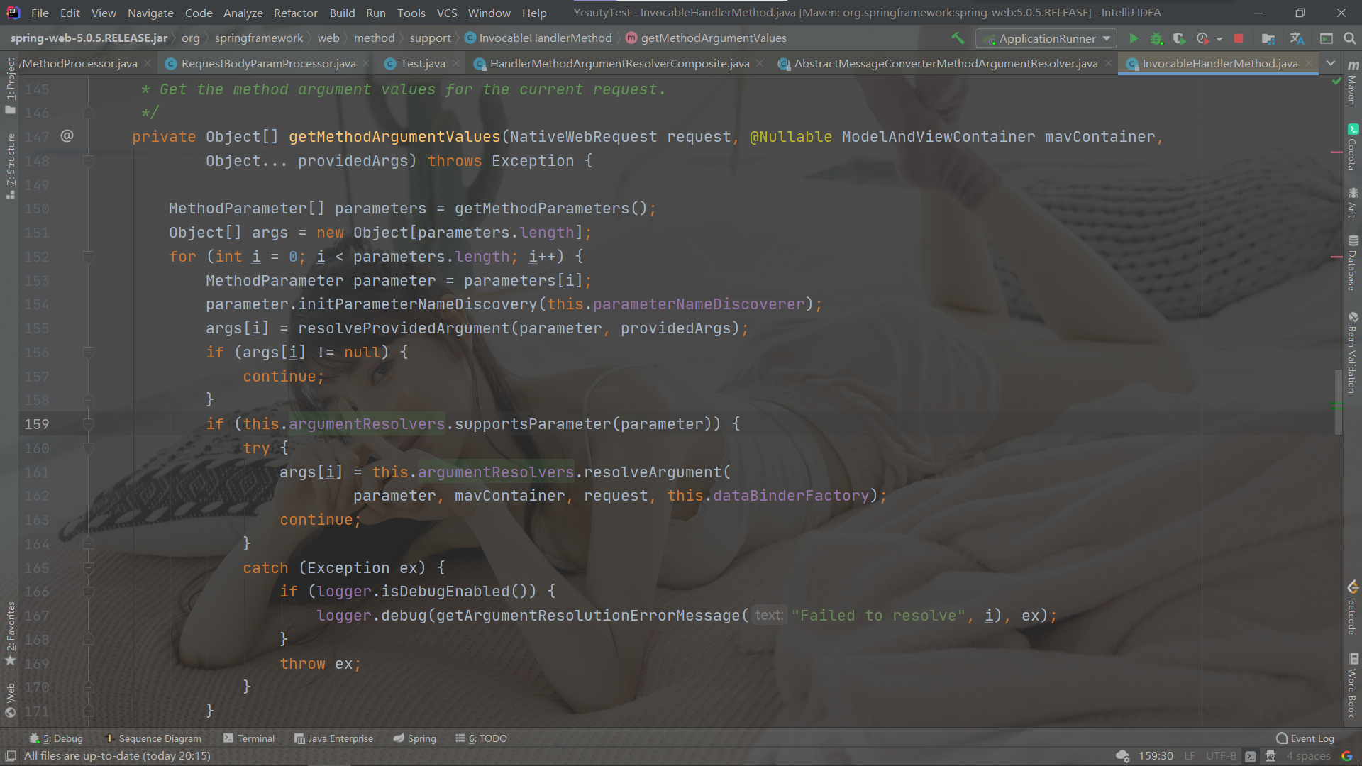 在InvocableHandlerMethod#getMethodArgumentValues中,它会遍历当前HandlerMethod的参数,对于每一个参数,它都会通过HandlerMethodArgumentResolverComposite#supportsParameter来判断是否可以被解析器解析,如果可以被解析,则通过HandlerMethodArgumentResolverComposite#resolveArguement进行解析