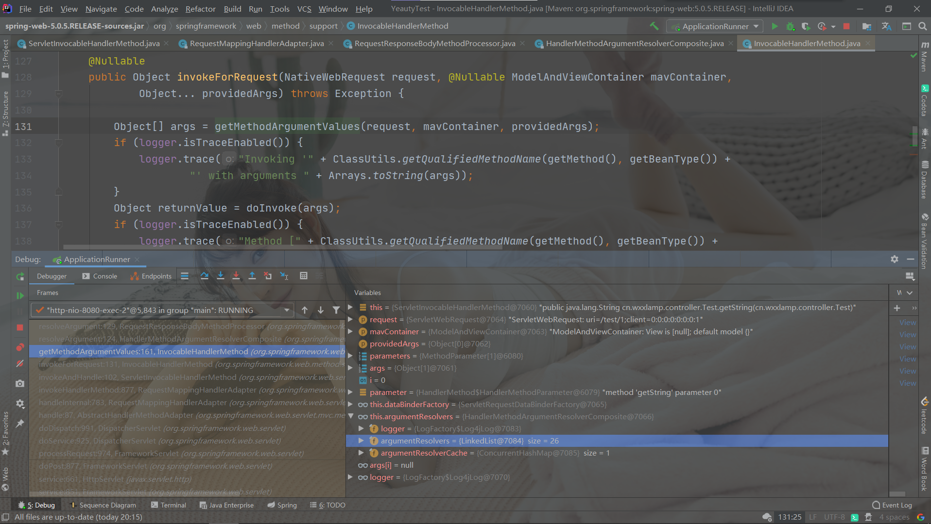 从图中我们可以看到,RequestMappingHandlerAdapter在初始化的时候会把系统给定的,自定义的参数解析器加载到内存中。