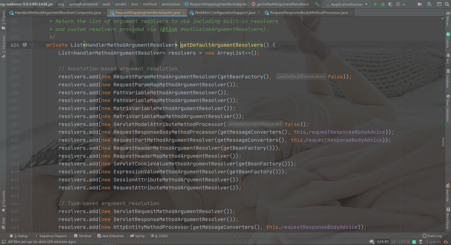 那么RequestResponseBodyMethodProcessor是如何被注册到resolver中呢?主要是在RequestMappingHandlerAdapter中: