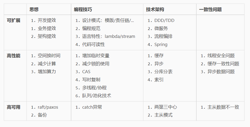 到了21年我毕业之后到杭州工作,接触的业务项目越来越多,对技术的认知也变得更偏向业务层面。而且,原来的体系更偏向于文章归类的维度,而我更想建立一个技术统一的方法论。所以,更进一步,从开发的角度出发,我开始把技术分为两个核心,业务开发的一个核心是实践,而实践中还包括两种,一种是微观的编程实践,一种是宏观的架构实践。另一个核心,则是思想,这种思想模式包括:可扩展,高性能,高可用,以及在这三者中可能出现的一致性问题。