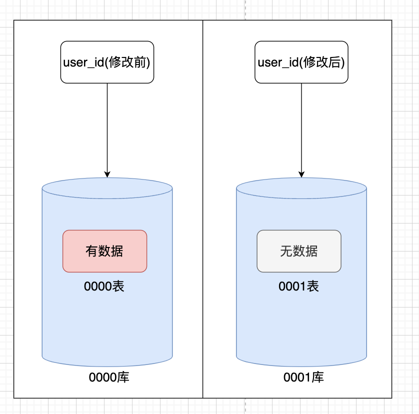 按照原有的分库分表逻辑,user_id对应的记录应该落到0000库0000表中,当我们对0000库0000表的user_id进行修改后,这条数据还会存在于当前的物理库中。