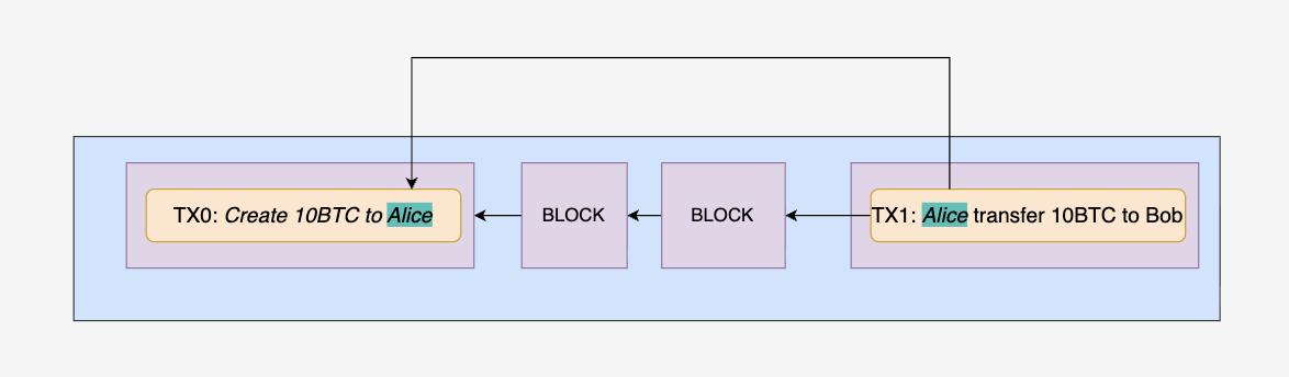 UTXO可以理解成是以交易和收款人为key的map,value是当前交易的输出是否被其他交易花掉。以上图举例,TX0给了Alice 10 BTC的出块奖励,那么包含TX0区块的UTXO就是{'TX0:Alice': false},代表TX0交易的输出未被花掉。当TX1被打包到区块中后,那么包含TX0区块的UTXO就会变成{'TX0:Alice': true},代表TX0交易的输出已经被花掉。之后,如果TX2再指向TX0,节点验证时发现TX0的输出已经被花掉了,就会判断TX2是笔非法交易,不会把TX2打包到区块中。