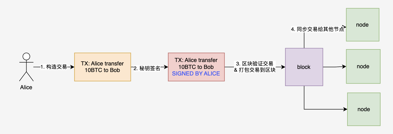 基于非对称加密的特性,在Alice给Bob转账的交易中,Alice除了1)写下交易信息之外;还要2)通过私钥对自己的交易签名;3)写下自己的公钥信息,供节点打包到区块时对交易的签名进行验证。