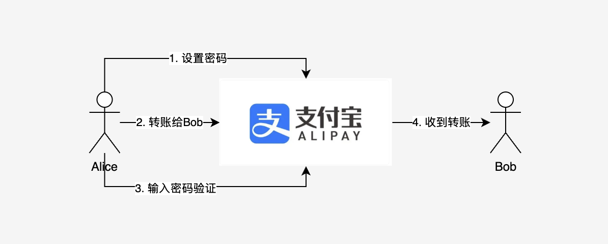 考虑如果Alice通过支付宝转账给Bob的场景,在扫码支付前,Alice需要输入密码验证当前支付宝账户确实是她自己的。这其中有两个步骤,第一个步骤是转账前需要在中心化的支付宝中设置密码,第二步是转账中输入密码被中心化的支付宝验证通过。