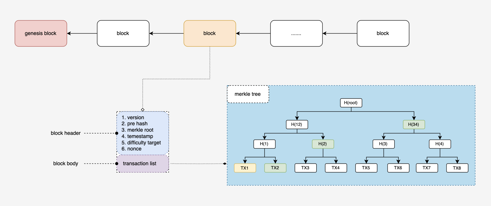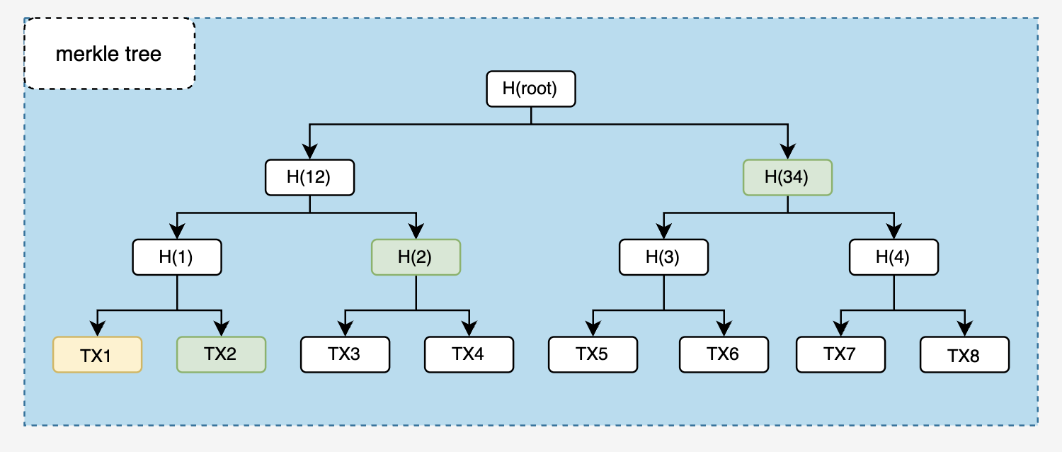 Merkle Tree有一个特性,即给出部分Hash值(即Merkle路径),就可以验证某一笔交易是否存在。基于上图我们可以举个例子,如果一个轻节点要验证TX1交易是否存在,全节点只需要给出TX2、H(2)和H(34)的hash值,轻节点就可以计算出Merkle根hash,然后将这个hash与轻节点自己区块头的hash做对比,如果相等,则说明TX1这个交易确实存在。