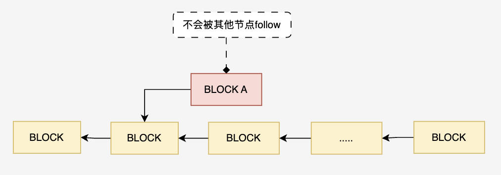 考虑一种情况,节点新产生了一个合法区块A(区块中的交易也是合法的),但是这个合法区块A中的pre hash是一个几年前的区块hash(如下所示),这个区块会被其他节点接收么?