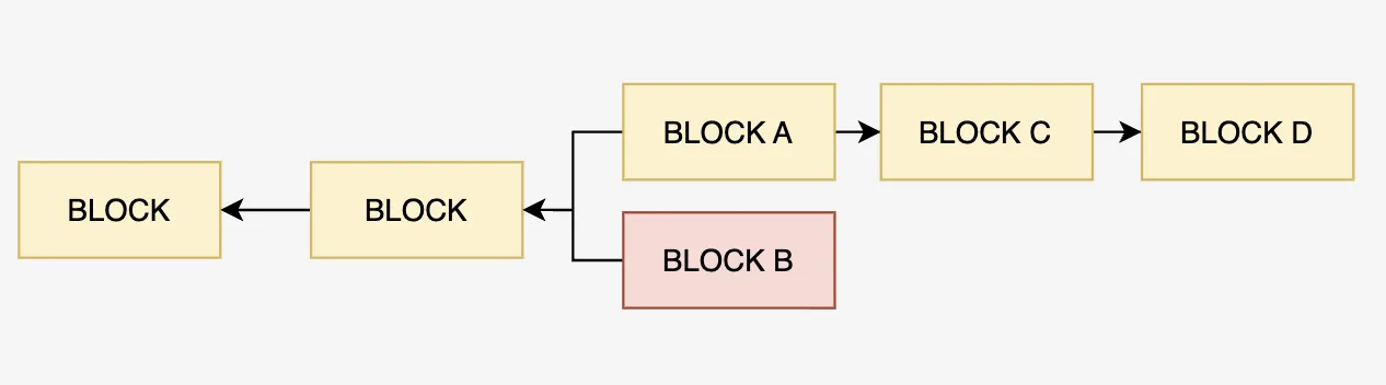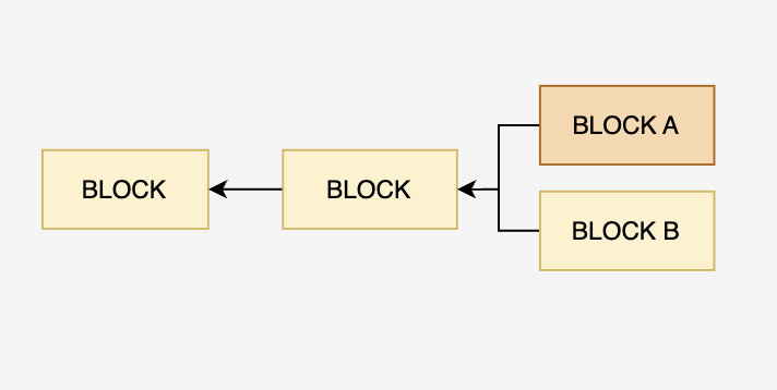 此时其他节点会接收A和B两个区块(因为他们的工作量一样大),但是,因为网络的不确定性,一定有一些节点是从BLOCK A 开始挖,有些节点是从 BLOCK B开始挖。假如BLOCK A后面先挖到了一个新区块,那么其他节点就认为以BLOCK A的那条链是最长合法链,从而丢弃BLOCK B。BLOCK B被丢弃后,它里面发放给对应账户的铸币交易也会失效。