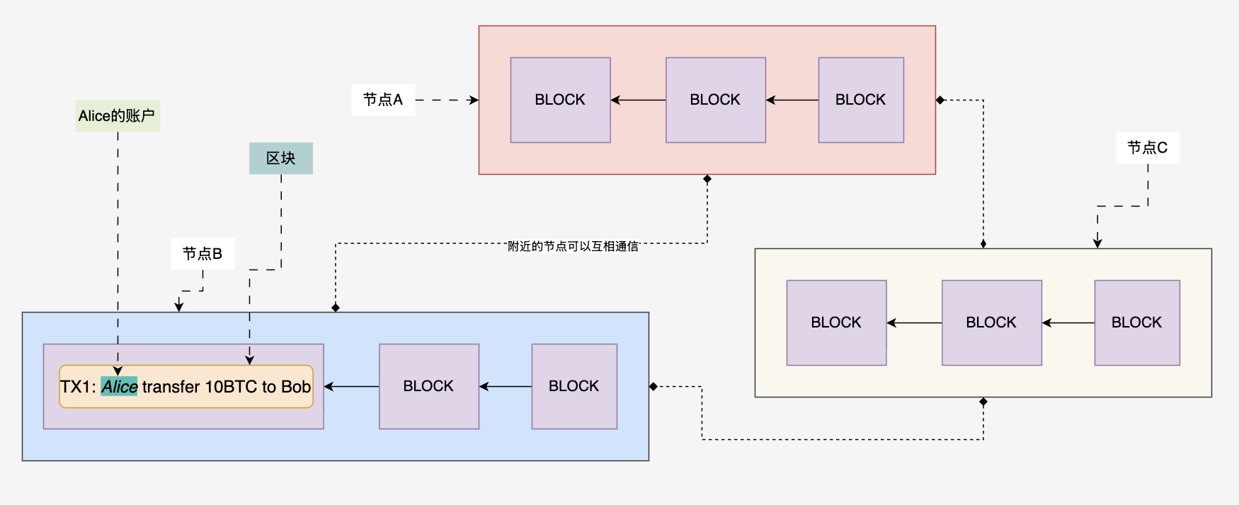 通过本文讲述的共识机制和比特币数据结构,我们来尝试复原一下,当“Alice给Bob转账10 BTC”时,比特币网络中的所有节点,是如何变化的: