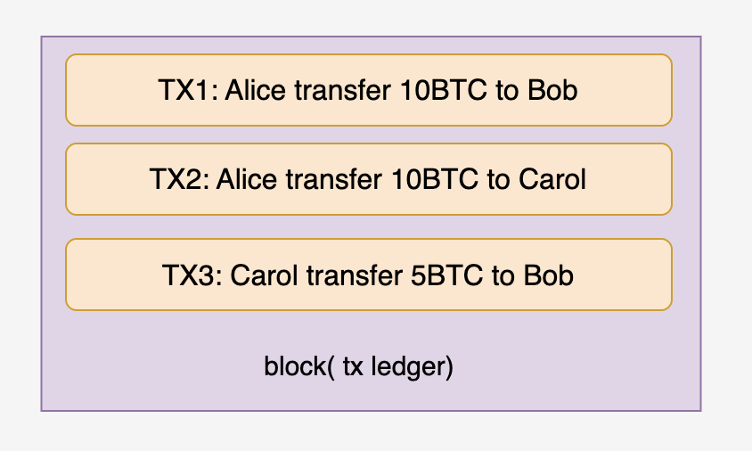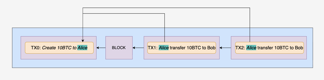 - 假如Alice之前因为挖矿获得了 10 BTC的出块奖励,之前已经转给了Bob 10 BTC,过了一段时候后又转给了Bob 10 BTC,区块该如何拒绝?