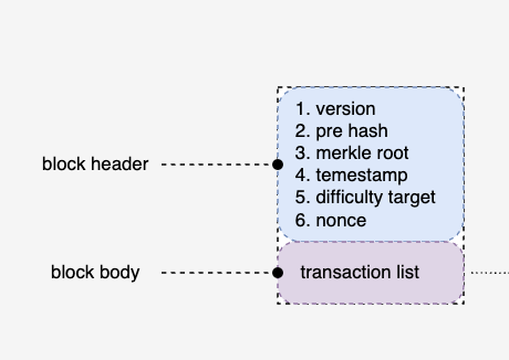 - 区块 a 生成时,先将自身所有交易通过 Merkle Tree(下文会讲)计算出所有交易的最终 Hash 结果(Merkle root),并将其写入自己的区块头