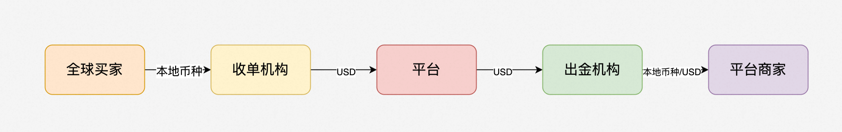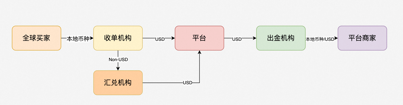 对于一个跨境平台来说,因为建设初期,为求快速建站,收单平台会提供USD结算能力,所以不需要引入外汇机构。注意,因为我们是跨境平台,所以在当前美元霸权的体系下,我们默认的首选结算币种都是USD。
