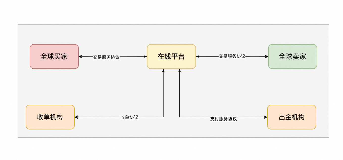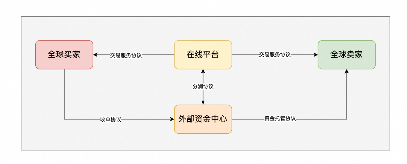 以一个基础的跨境在线交易平台举例,如果平台没有资质感知买家的资金,除了买卖家、平台之外,还需要有一个额外的资金中心。协议如下: