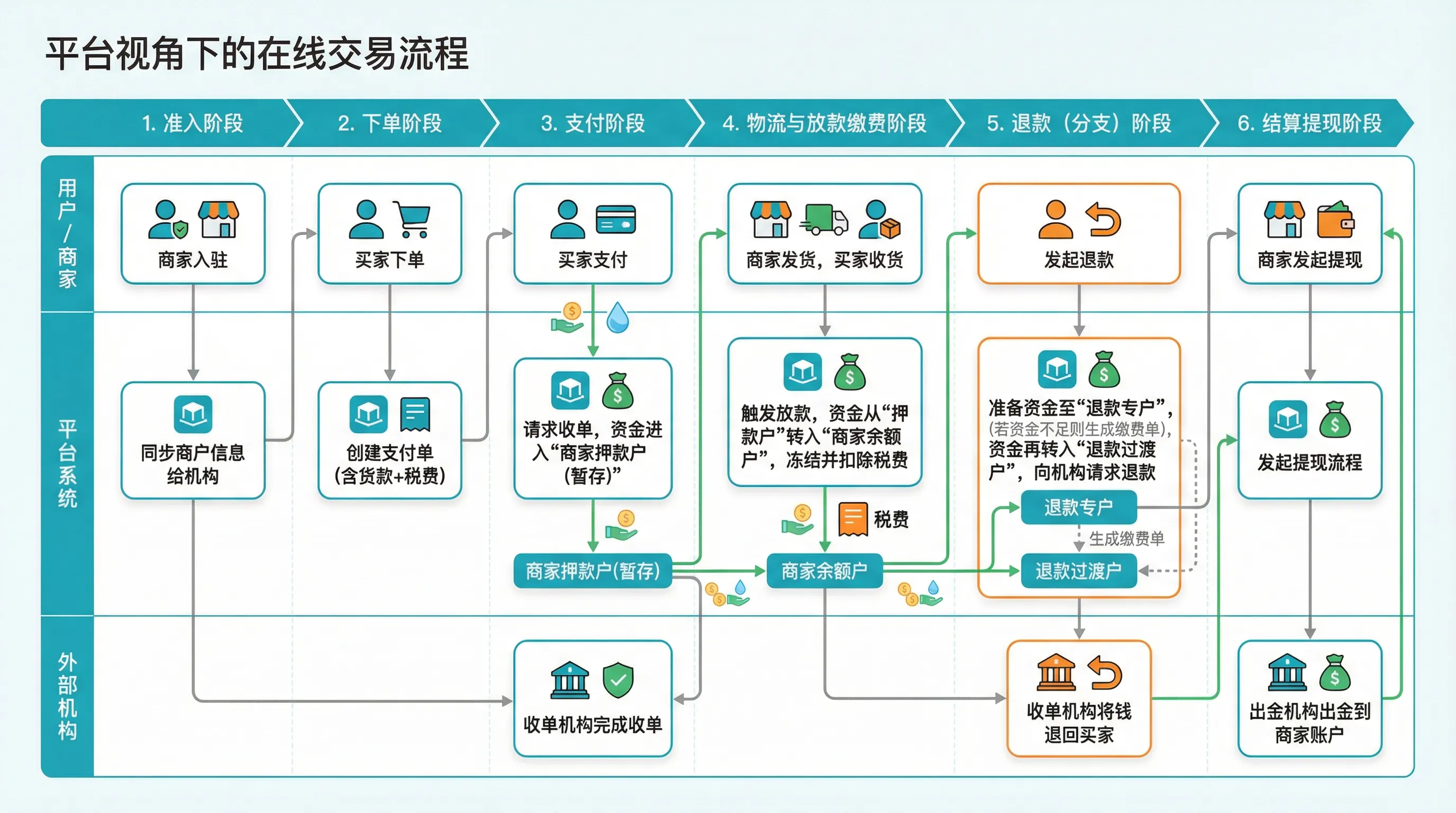 对于普通的消费者来说,这个只是买卖家在平台上完成了一笔交易,但是从平台的角度出发,交易的参与方不仅涉及平台和买卖家,还会涉及到中间的各种资金渠道。