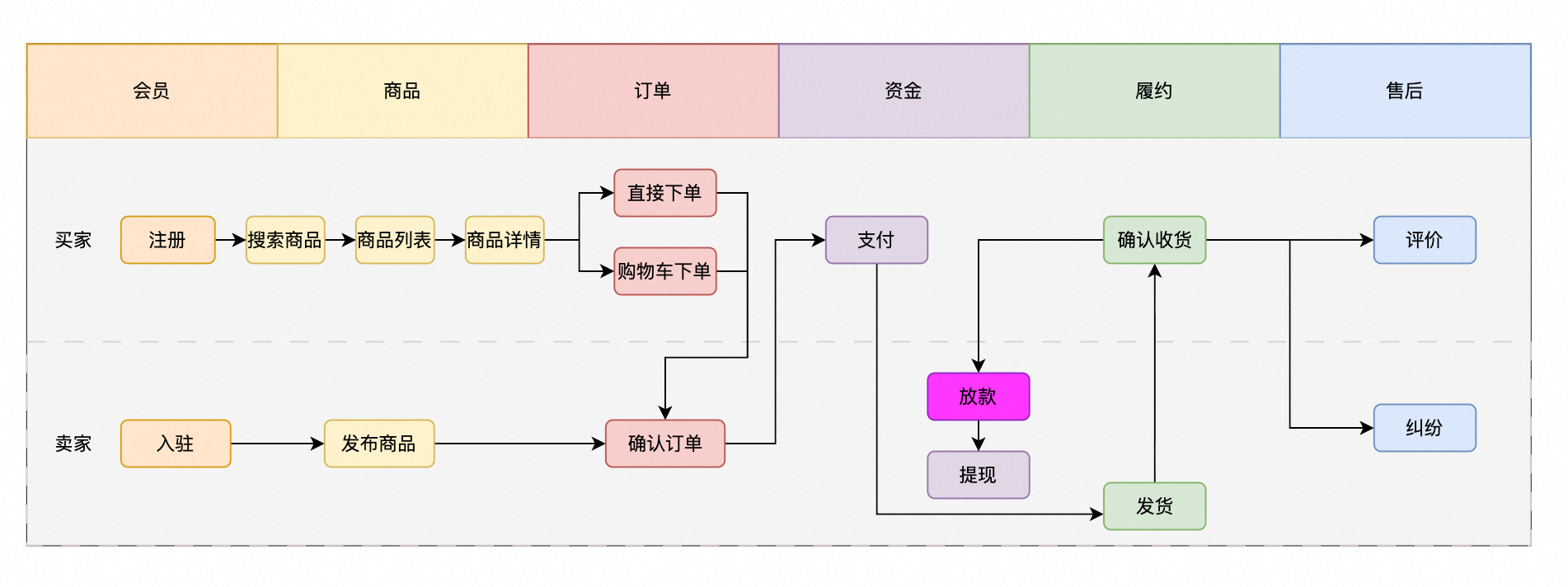 从平台视角来看,我们要核心串联起在交易和资金环节,不同业务领域的流程。一个简化的流程图如下所示: