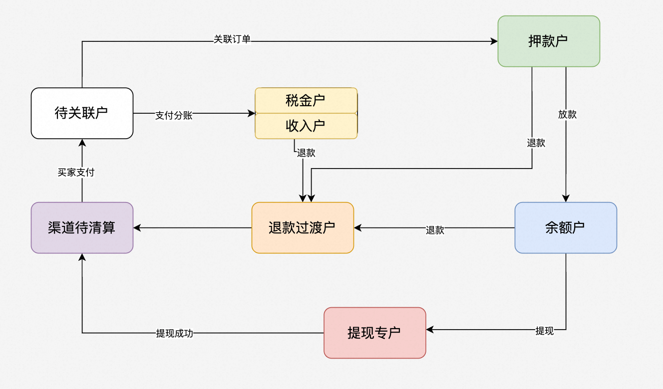 - 退款过渡户:买家发起退款后,我们需要通过资金准备的方式将钱汇集到退款过渡户中,打给支付渠道