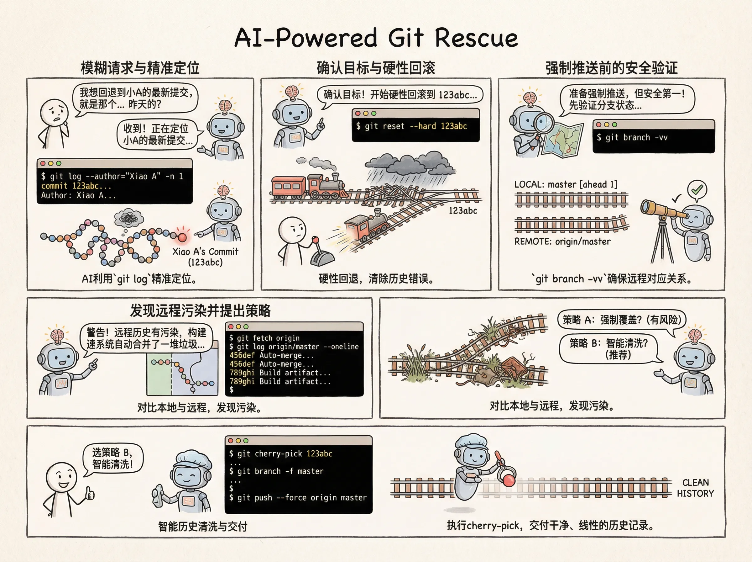 明白了。这是一个复杂的“变基清洗”任务。 策略:基于干净的节点创建一个临时分支,从旧分支中“捡出(Cherry-pick)”属于小A的有效提交,拼接到新分支上,最后替换原分支。