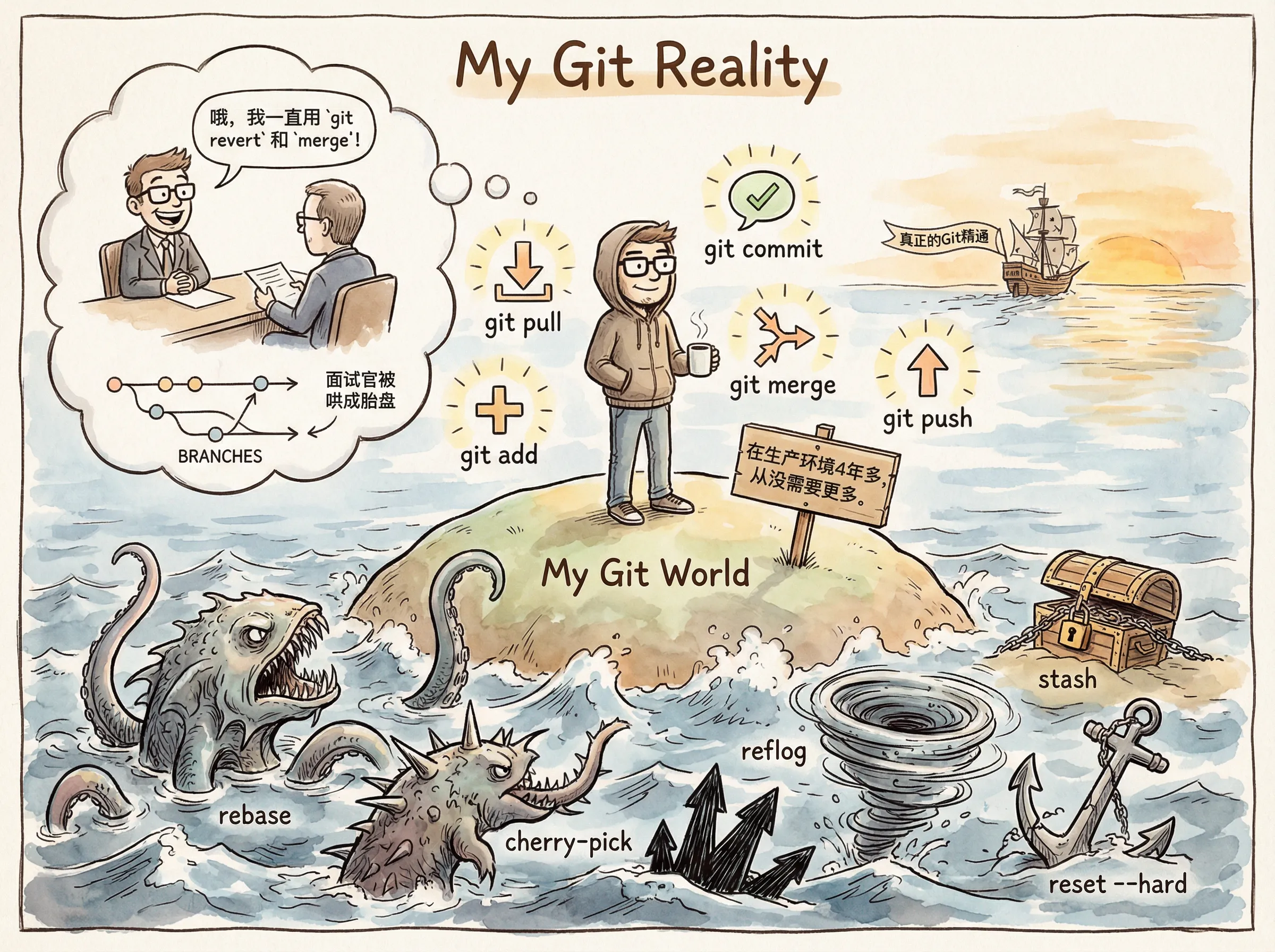 工作四年多,只会pull、add、commit、checkout、push五剑客,复杂的git指令和协作流程日常也没怎么用到,所以工作之后也就没有动力仔细了解过其他复杂的git指令。