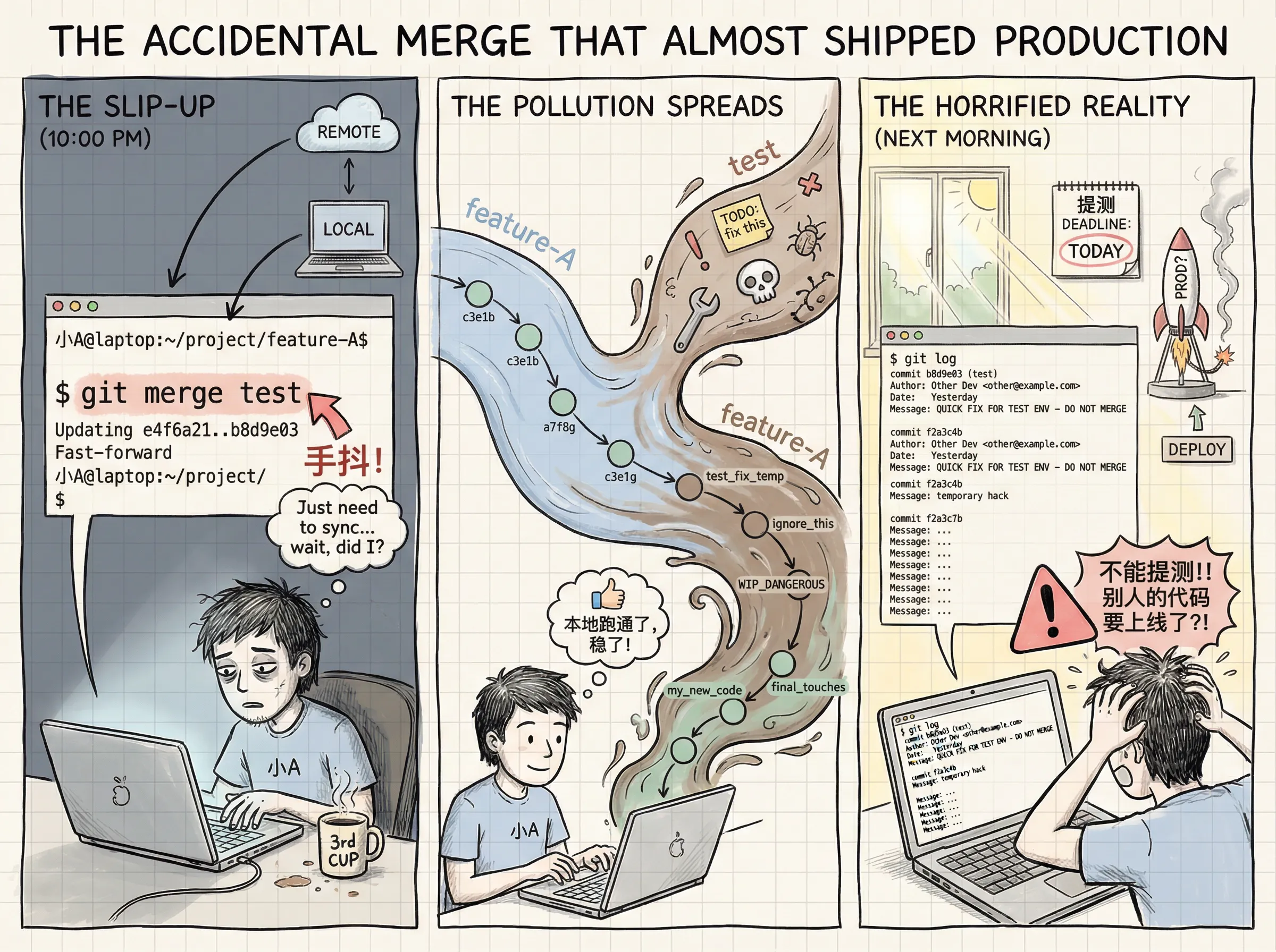 当他终于本地提交了几轮,确定本地代码没问题后,准备push到远程测试分支的时候,才突然发现,自己的分支已经被测试分支污染了——而他第二天就要提测和发布了,怎么可能将别人的测试分支也发布上线呢?