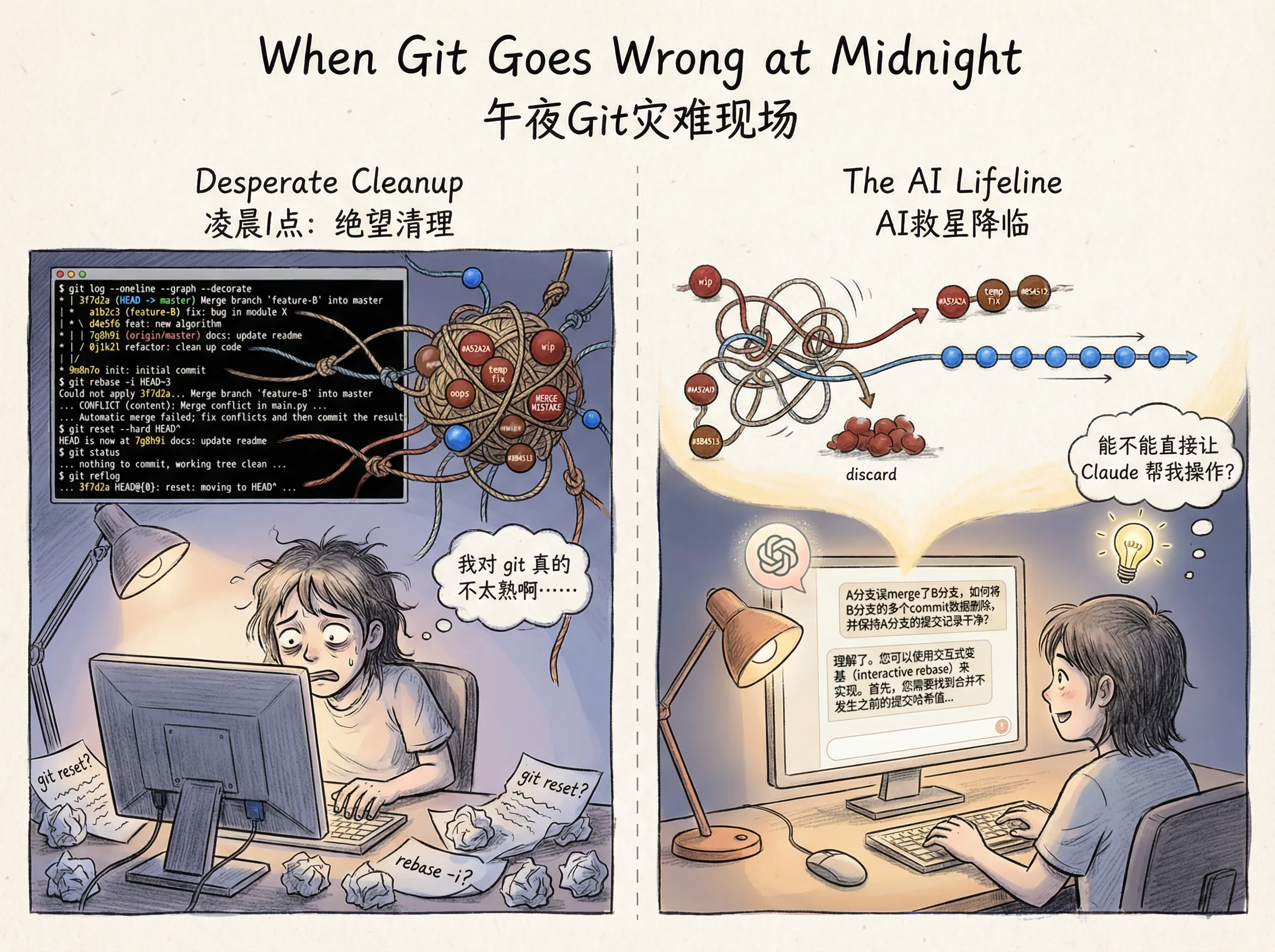 正当我敲入问题“A分支误merge了B分支,如何将B分支的多个commit数据删除”,准备按下回车键时,突然想到:“能不能直接让claude帮我操作?”
